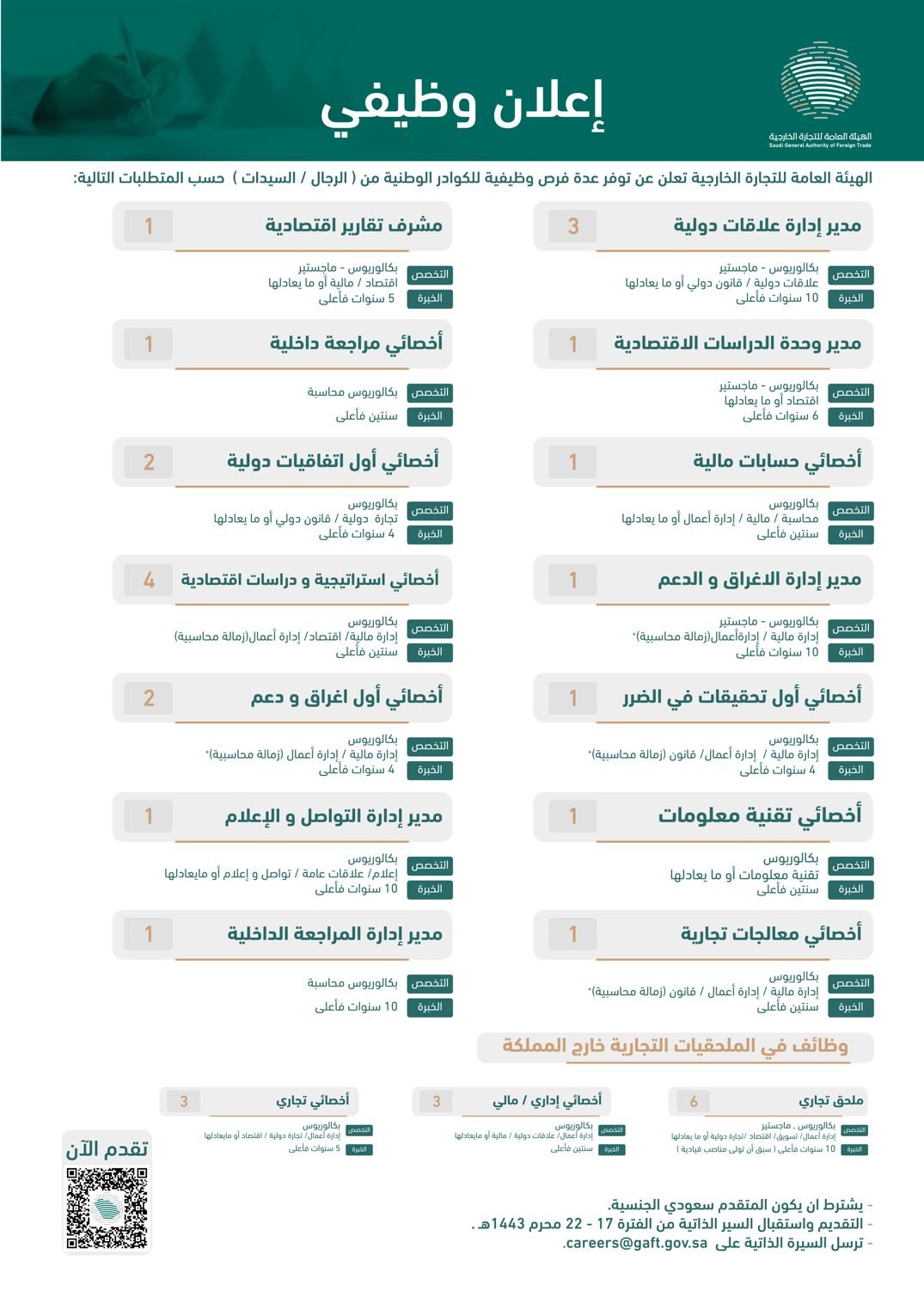 الهيئة العامة للتجارة الخارجية تعلن عن توفر عدد (33) وظيفة ادارية، للتسجيل ارسال السيرة الذاتية على الإيميل مع ذكر المسمى الوظيفي في عنوان الإيميل careers@gaft.gov.sa